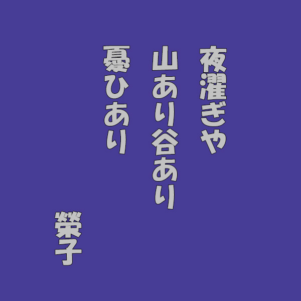 [ 遠き日の父の詠みたる岩桔梗 ] [ もぎたての桑の実甘き夫甘き ] [ くるくると日傘を廻し夫を待つ ] [ ひたひたと寄せ来る波や月見草 ] [ 砂浜や色なき風のこゑのして ] [ 子燕の日差しを避けて貌かくす ] [ 月あかり友のたよりと歳時記と ] [ 秋を待つただひたすらに秋を待つ ] [ 十薬の匂ひたつかな風吹けり ] [ 新しき眼鏡馴染みて明け易し ] [ 森のにほひ草のにほひや誘蛾灯 ] [ 真夏日や真白き鳥の翔びたちぬ ] [ 睡蓮の眠り覚ますや鳥のこゑ ] [ 青かへで葉の重なりて影となる ] [ 草いきれ草の向かふに父のゐて ] [ 短夜の夢の続きは明日にあり ] [ 麦笛やむかし昔の空の色 ] [ 百日紅ぽとんと落ちて方丈記 ] [ 夜濯ぎや山あり谷あり憂ひあり ] [ きりきりと鳧啼く空の黄昏ぬ ]