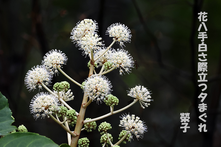 この作品の良さは八手の花の白さと夕まぐれ🟰オレンジ色のお空との対比にあります。