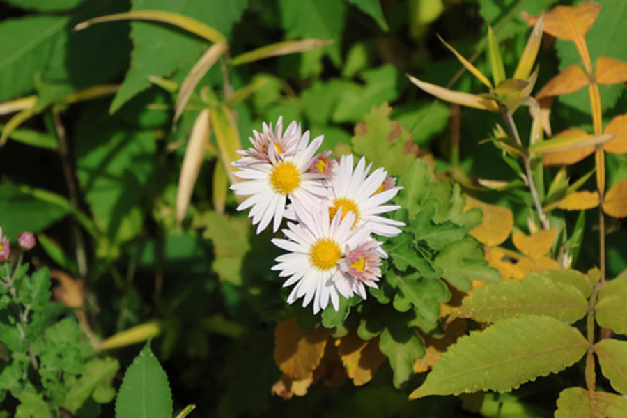 2025/11/24 散歩道 自宅近くの散歩道。家を出て、ほんの少し歩いただけで色々な植物が待っていてくれる。その出会いのひとつひとつが新鮮で心躍るものである。 この日の出会いで、まず目に留まったのは、ヒナギクの花。つづいてシモツケ。ひっそりと目だたないこの2種の花は、心癒してくれるものである。紫陽花の葉の色も新鮮に見えた。その季節には、皆の心をひきつける花を見せてくれるが、季節外れの葉も趣があって良いものである。