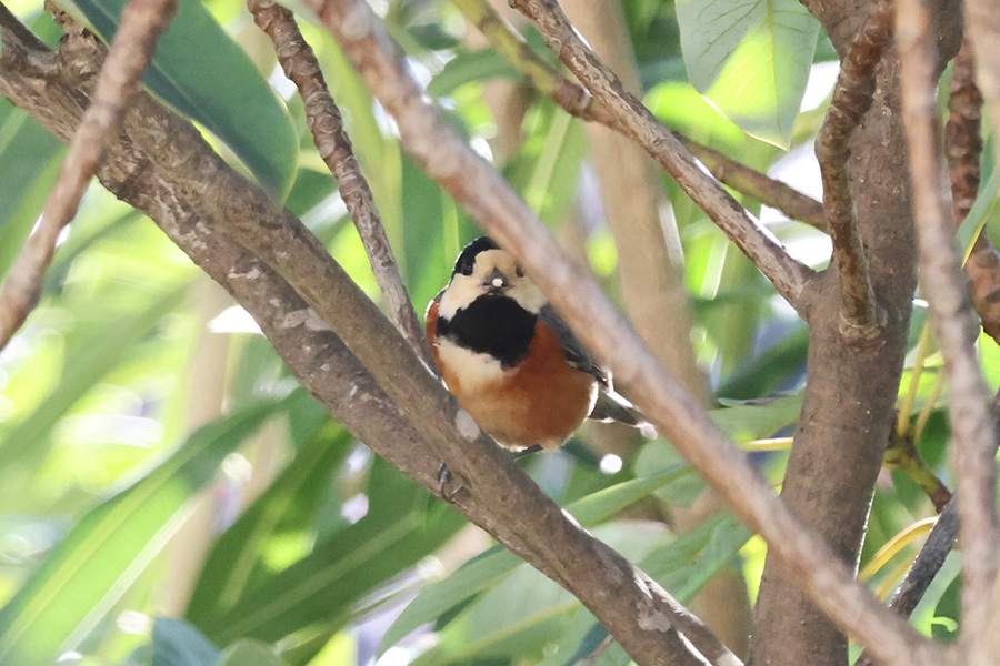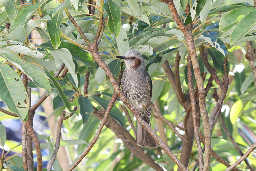 朝日が眩しくて良く見えないのだが、何とかヤマガラの位置が分かった。しかし、小枝が邪魔をして、なかなか良い位置にには移動してくれない。一心に木の実(おそらくエゴノキの実)を打ち付けている。やっと木の実をつまむことが出来たようだ。そこにヒヨドリが邪魔に入り、今日のヤマガラの舞台は終わりである。