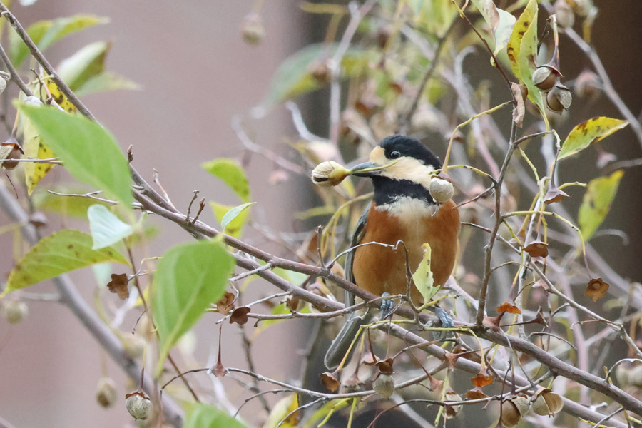 少し足を伸ばすとエゴノキが数本見えてくる。その中の一本にびっしり実をつけたエゴノキがあり、ヤマガラが一羽飛んできた。少し離れて静かに待つと次々にヤマガラが飛んでくる。多いときには、一本のエゴノキに6羽ほどヤマガラが集まって熱心に採餌している。その様子が、なんとも微笑ましくて心和むものがあった。