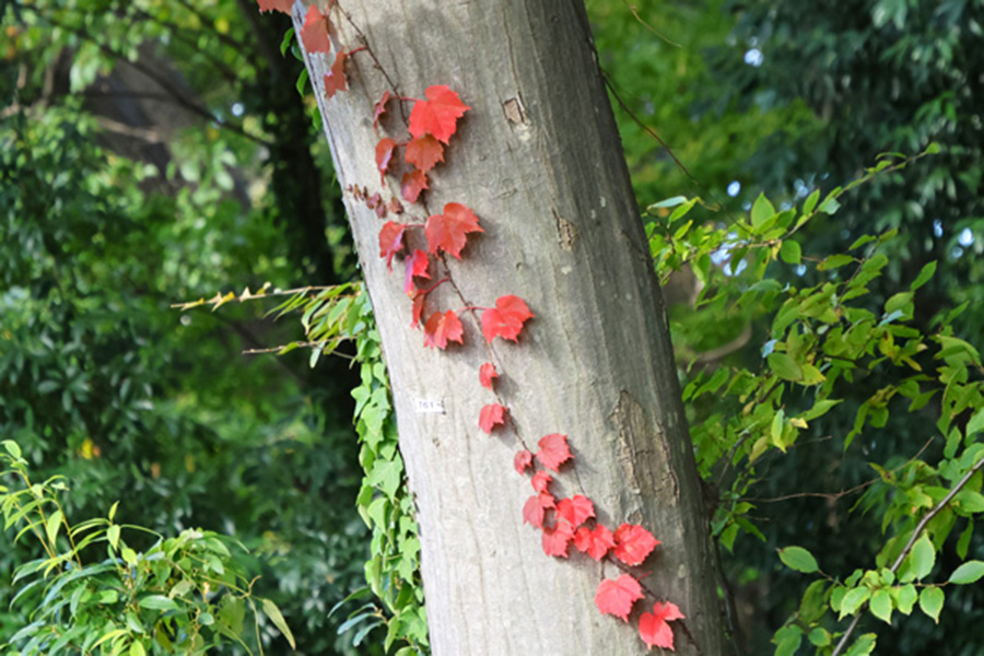 この日、やわらかな日差しの中で真っ赤なツタが心和ませてくれた。緑の葉と共に、その姿は、実に美しい。しばらくこの美しい姿を楽しませてくれることだろう。