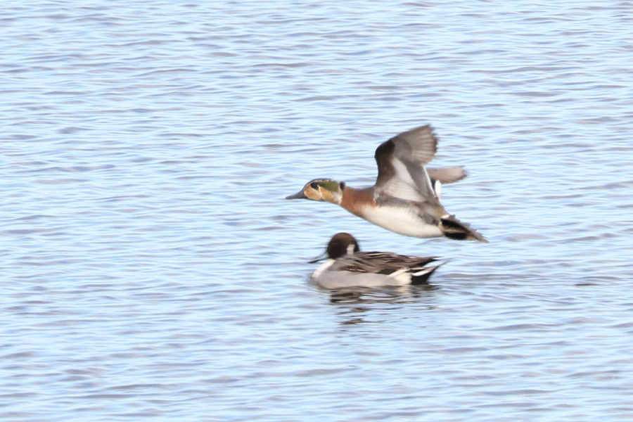 その群れの中の一羽が、オナガガモの上を「ちょっと失礼!」と言いながら飛んで行った。ほのぼのと心和む光景であった。