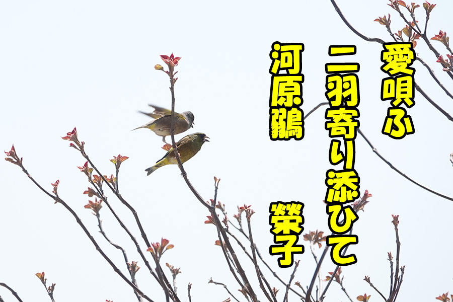 [ 愛唄ふ二羽寄り添ひて河原鶸 ]
