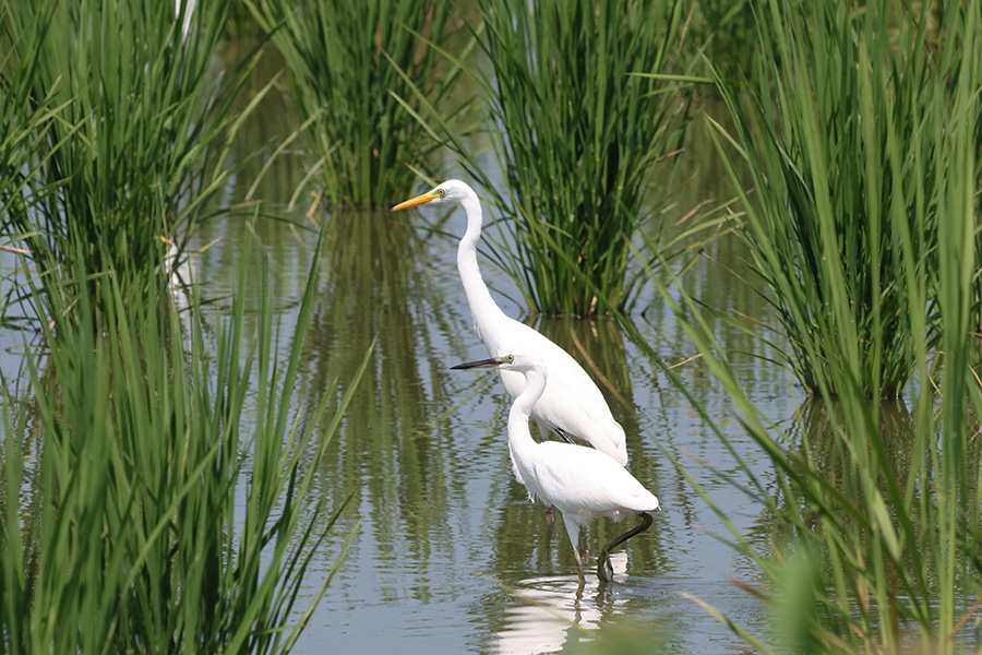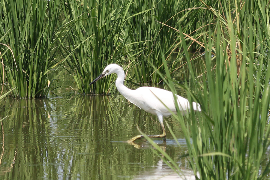 2025/9/2 コサギとチュウサギ 連日の暑さもほんの少しだけ空気が変わり暑さの中にも秋の気配を感じるようになってきた。少し前の出会いになるが、稲田の中にサギの群れが入っているのが見えた。小さな群れであったが、コサギとチュウサギのようである。 少し近づいてみると確かにチュウサギとコサギである。車中からの観察であるが、緑を背景に真っ白なサギの姿は、なかなか美しい。爽やかな光景に心和むひとときであった。