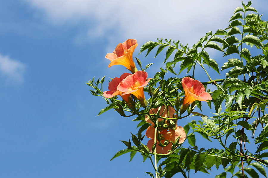 2025/9/3 散歩道 ずっと暑い日が続いていたが、天気予報どおり午後から雲行きがあやしくなってきた。数日前、青空が広がるなか、近隣をほんの少し歩いたことがあった。 最初に目に留まったのは、青空に映えるノウゼンカズラ。オレンジ色の花が青空に向かって誇らしげに咲いている。近くの桜の木では、アブラゼミが夏の名残を惜しむかのように元気いっぱい鳴いている。エゴノキの実は、びっしりと重たいほどに実をつけている。 身近なところに色々な出会いがあって、なんとも心和むことであった。