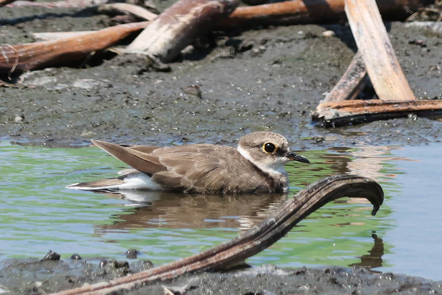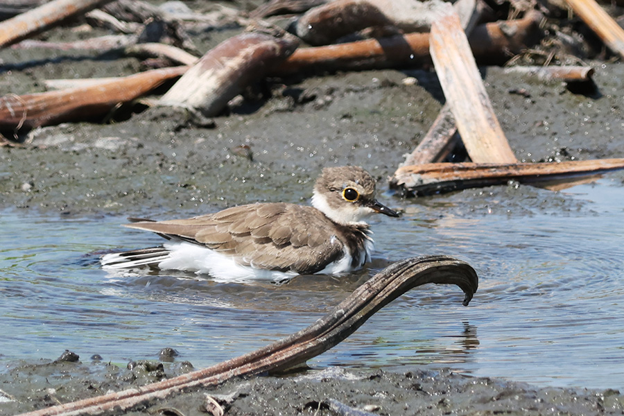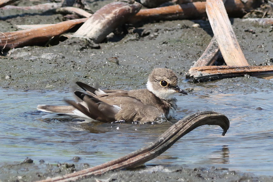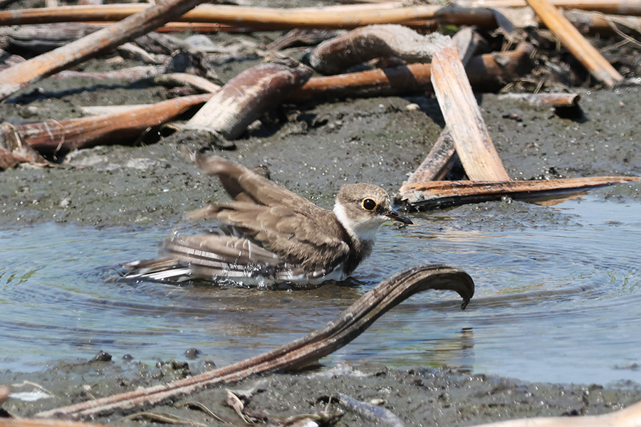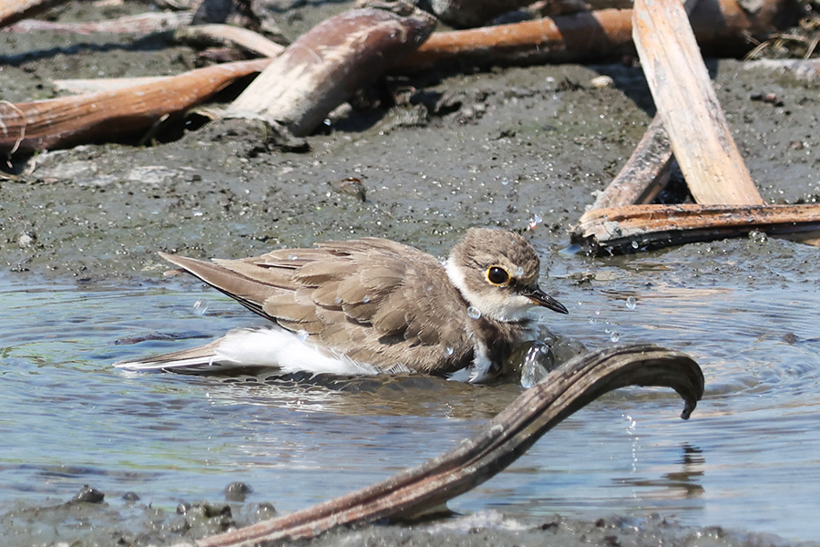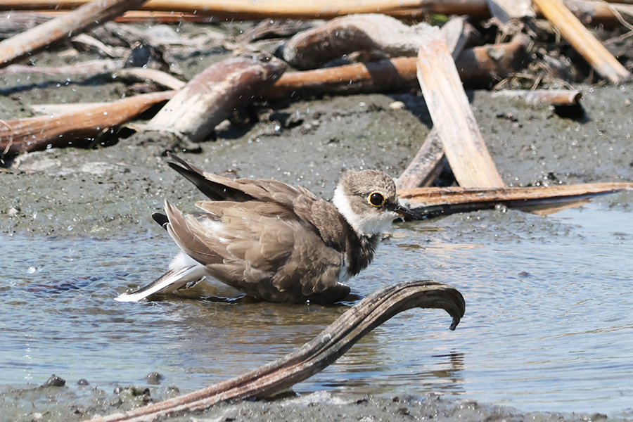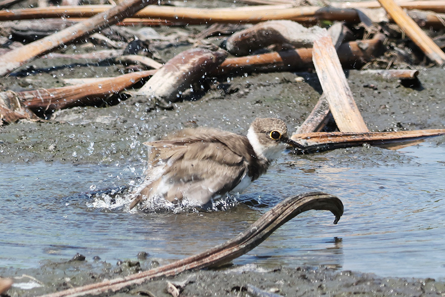 2025/9/6 コチドリ 蓮田地帯のシギチの動向がずっと気になっていた。車からの観察のみであるが、何とか出かけてみたいとの思いが実現し、9月に入ってから探索に出かけることになった。 限られた条件での観察であるので、シギとの出会いは、なかなか難しく、ずいぶん探し回って、やっと出会えたのがコチドリであった。そのコチドリが目の前で水浴びを始めた。ドキドキしながらその様子を観察し、レンズを向けた。蓮田地帯でのひとこまである。