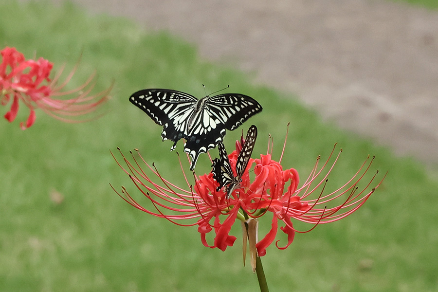 2025/9/29 彼岸花とナミアゲハ ずっと気になっていた彼岸花。あまり好きな花ではないが、道端で度々見かけ、一度写真に撮ってみたいと思っていた。お彼岸も過ぎたので、そろそろ人の出入りも少なくなってきた頃ではないかと思い、お寺に足を運んでみた。ちょうど良い時期に訪れたようで、真っ赤な彼岸花にナミアゲハが2頭飛んで来た。チョウとの出会いの少ない中、とても嬉しい出会いであった。