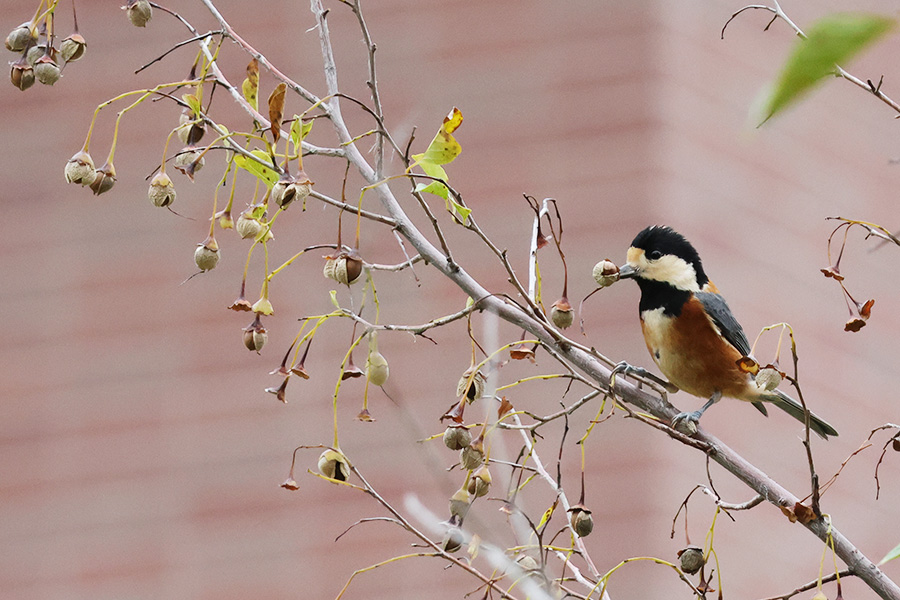 少し足を伸ばすとエゴノキが数本見えてくる。その中の一本にびっしり実をつけたエゴノキがあり、ヤマガラが一羽飛んできた。少し離れて静かに待つと次々にヤマガラが飛んでくる。多いときには、一本のエゴノキに6羽ほどヤマガラが集まって熱心に採餌している。その様子が、なんとも微笑ましくて心和むものがあった。