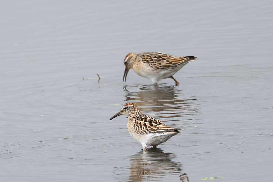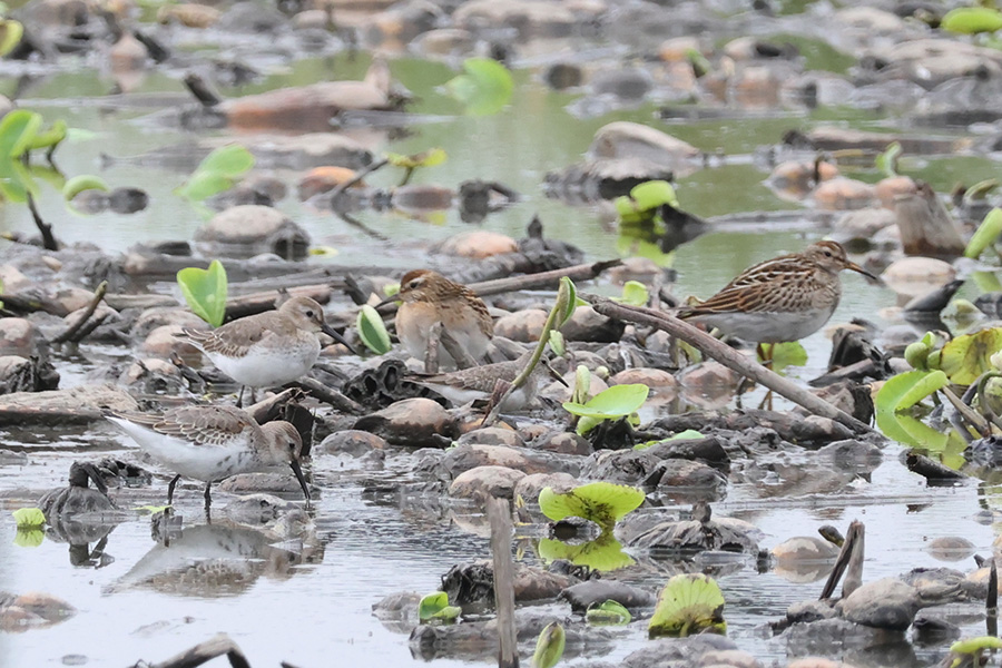 ウズラシギを見つけたときは、嬉しかった。ベレー帽のような赤茶色の頭部は、いつ見ても可愛くて癒される。そのウズラシギが3羽で仲良く採餌している様は、ほのぼのとして心和むものであった。