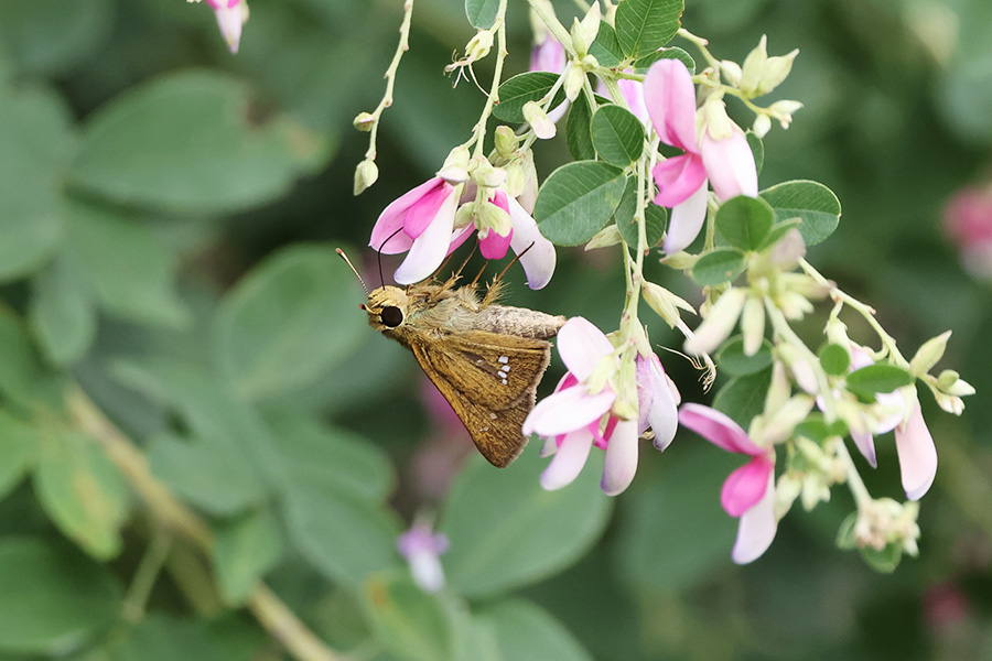 ようやく、近隣を少し歩いてみようという気になって出かけてみると白と赤の萩の花が咲き誇り、大歓迎という雰囲気で出迎えてくれた。そこには、セセリチョウがとまり、ゆったりと吸蜜している。何とものどかで心落ち着くひとときを過ごすことが出来たのだった。