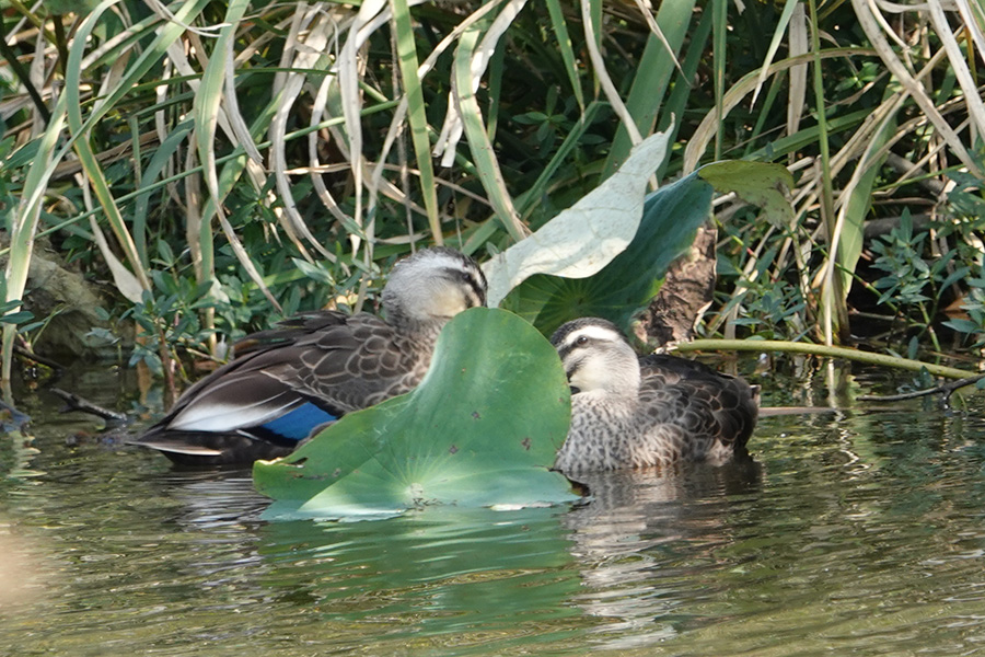 しばらくするとカルガモが二羽、三羽、五羽と姿を見せ蓮の葉の影になったりしながら、楽しそうに泳いでいる。そのうちの二羽が蓮の葉影に入って、まるでカクレンボでもしているようである。ほんのひととき、何とも心和む光景であった。