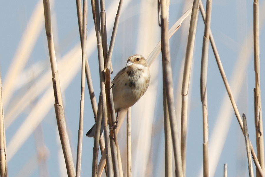 久しぶりに訪れた沼のほとり。ゆっくりゆっくり歩をすすめ、辺りを見渡してみると枯れた穂の先に何やら止まっている気配。じっくり見てみると何と嬉しいことにオオジュリンの姿。久しく出会いの機会のなかったオオジュリンである。この優しい顔が心和ませてくれて嬉しい限りである。冬の間、沼沿いの葦原で見かけることがあったが、ずいぶん長いこと出会いがなかった。