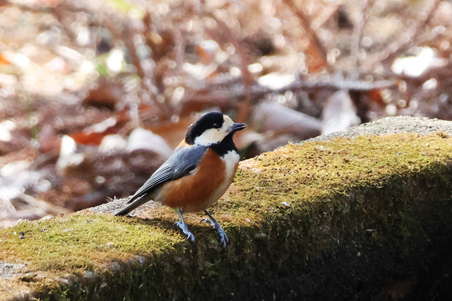 諦めてもと来た道を歩き始めてほどなく♫ニーニーニーとあの甘えた様な声が聞こえて来た。ヤマガラの声である。小さな水場があるので、降りて来てくれないかしら。と淡い期待で待ってみた。ほんの数分待ってみると何と嬉しいことに二羽のヤマガラが降りてきてくれた。嬉しい嬉しい出会いであった。