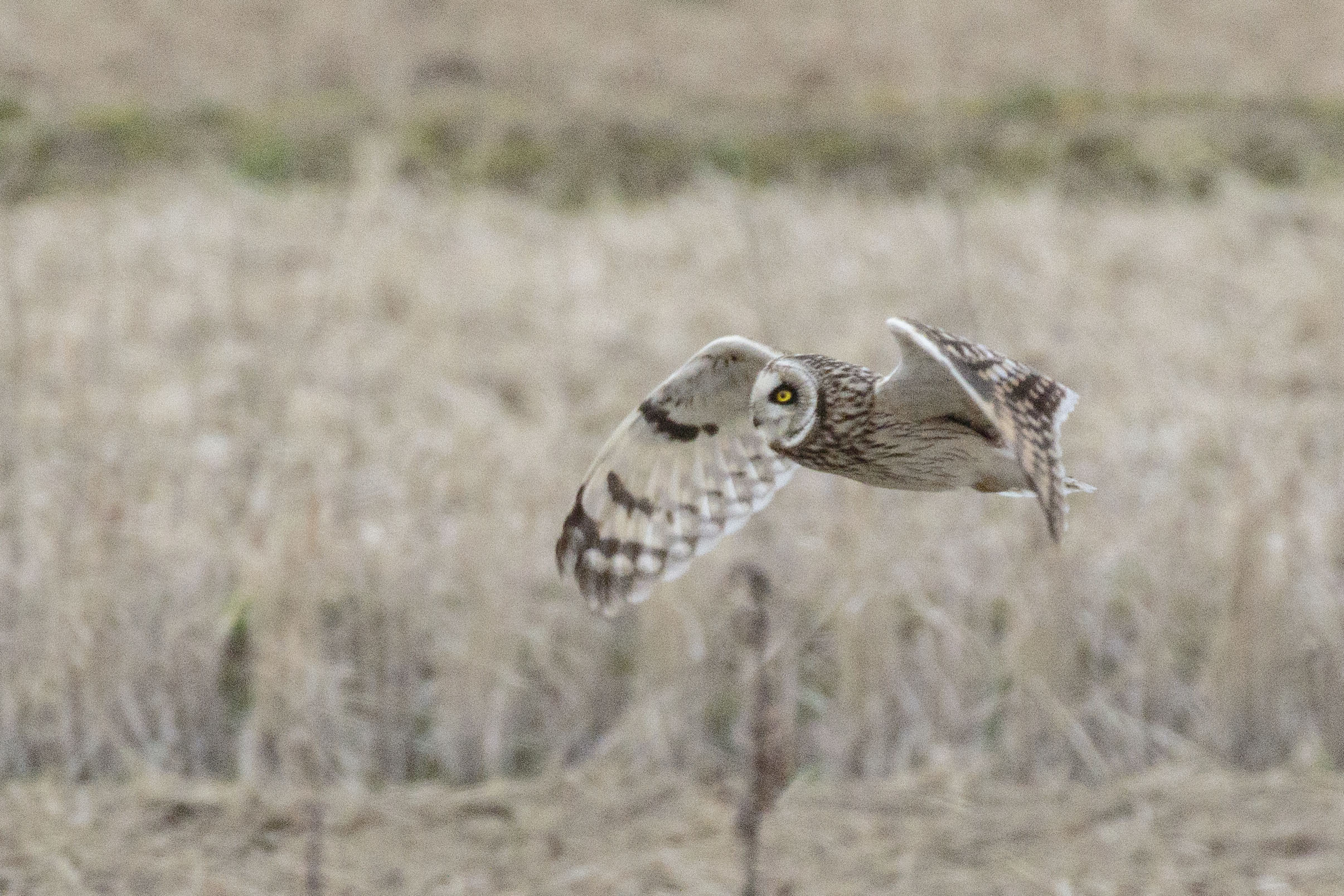 今季は、あちこちでコミミズクが姿を見せてくれたようで、ブログやFBなど、コミミズクの姿で賑わっていた。私が,初めてコミミズクに出会ったのは、ある年の元日の朝であった。遠くを飛んでいる鳥の姿を見て飛び方からおそらくコミミズクではないかと思った。ドキドキしながら近づいて来るのを待ったあの日のことが、懐かしく思い返される。今年は、鳥見に出掛ける機会が少なく、数年前の画像であるが、思い出のひとこまとして掲載させて頂いた。