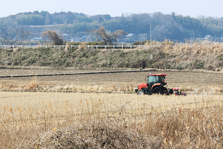 早春の田園風景。野の花との出会いも期待しながら近くの田んぼを車で少し回ってみた。乾ききった田んぼが広々と広がり、見渡す限りベージュ色の世界が広がる。ダイサギらしい姿を遠くに見かけただけでスズメとの出会いすらない。何とも殺風景な世界が広がるばかり。ようやくトラクターを見かけ何とか一枚、写真を撮らせていただいた。これから芽吹きの時期を迎えれば乾ききった田んぼにも変化が見えてくることだろう。