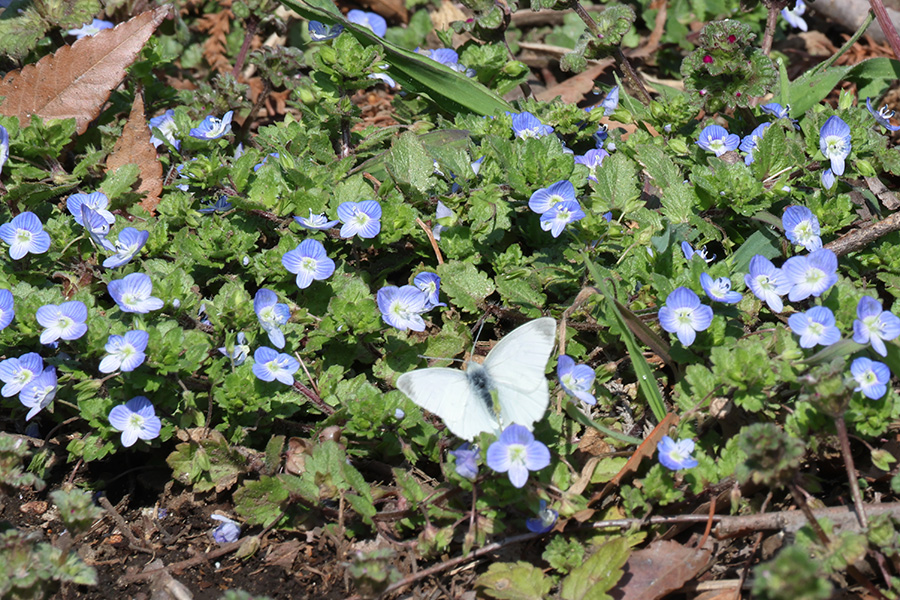 足元を見るとオオイヌノフグリが優しいブルーの花をいっぱいに咲かせている。牧野富太郎の命名によるというオオイヌノフグリ。別名、星の瞳とも言われている。一面に咲く光景は、まさに星の瞳。そこにモンシロチョウが、ほんの一瞬、姿を見せてくれた。散歩道は、のどかである。