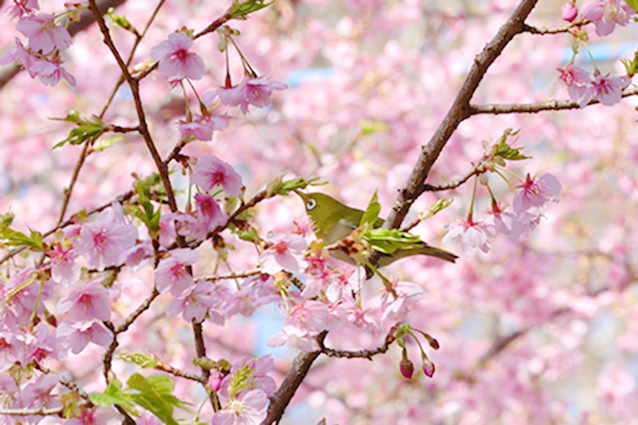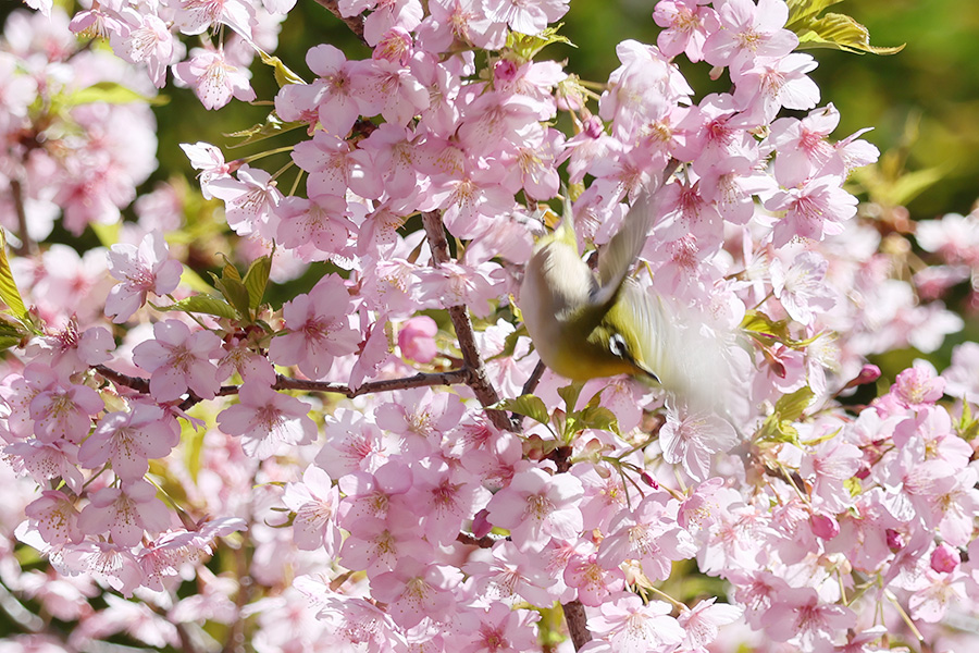 河津桜があちこちで美しい花を咲かせ、そこにヒヨドリやメジロがやってくる。ヒヨドリは、体も大きいし声も高らかでこぶりのメジロは、あっという間に姿を隠してしまう。大抵、すぐ近くに逃げ場があって、メジロは、こんもりとした植え込みに姿を隠してしまう。これは、数か所の河津桜のところで観察して感じたことである。